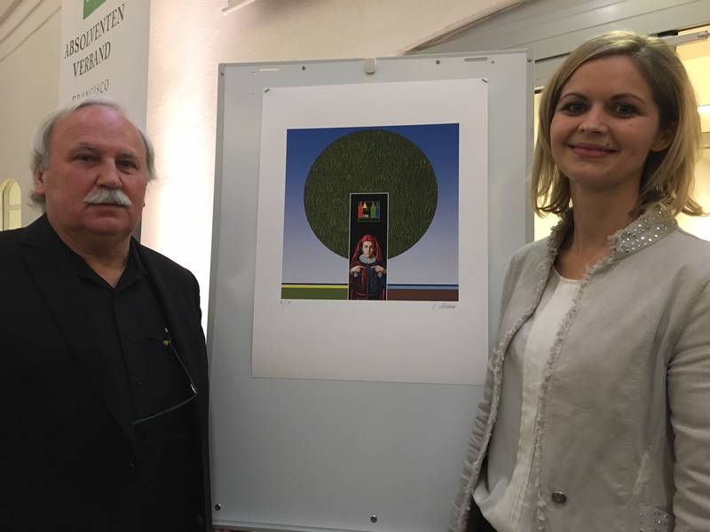 Diese wurden vom Künstler persönlich, hier im Bild mit AV-Vizeobfrau Claudia Zinner, beim Neujahrsempfang imSchloss Weinzierl erstmals präsentiert.