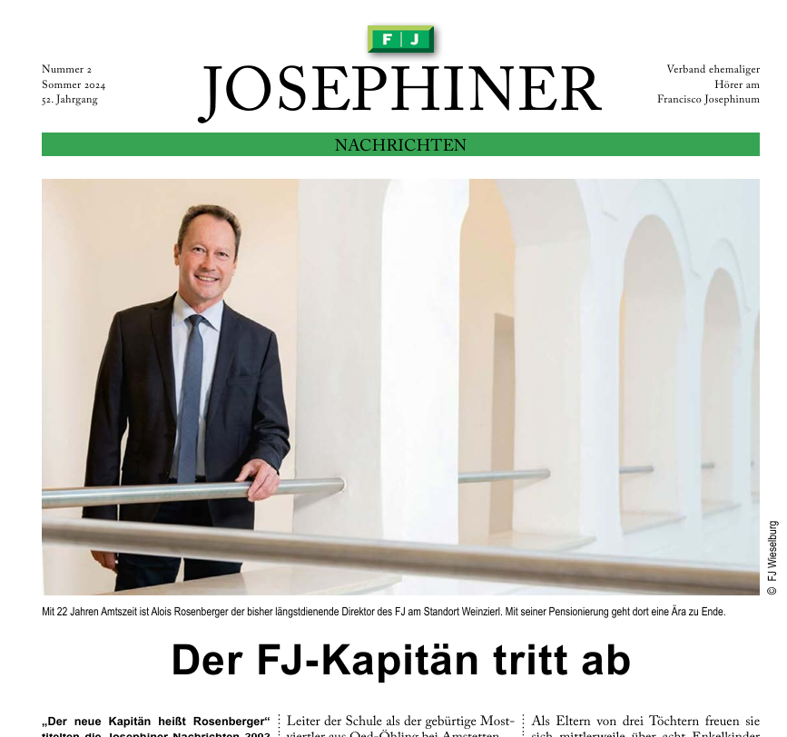 Die aktuelle Ausgabe der Josephiner Nachrichten wird demnächst in gedruckter Form bei den Mitgliedern des Absolventenverbandes FJ eintreffen und kann bereits jetzt von www.josephiner.at/service/josephiner-nachrichten heruntergeladen werden.