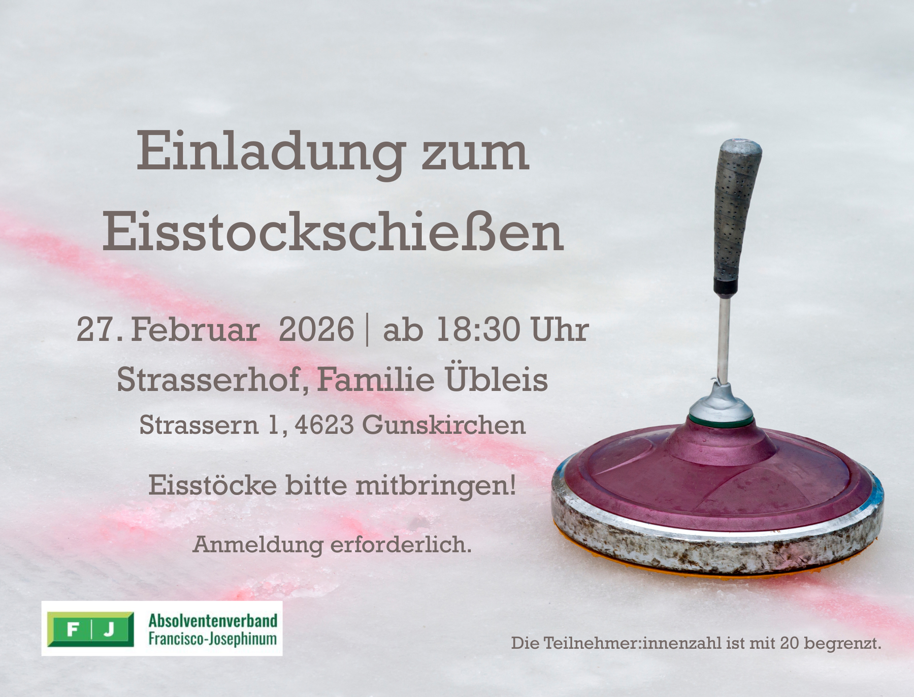 Das OÖ-Josephiner-Stammtisch-Team lädt herzlich zu einem gemeinsamen Eisstockschießen der Elmberger, Florianer und Wieselburger Absolventinnen und Absolventen ein.